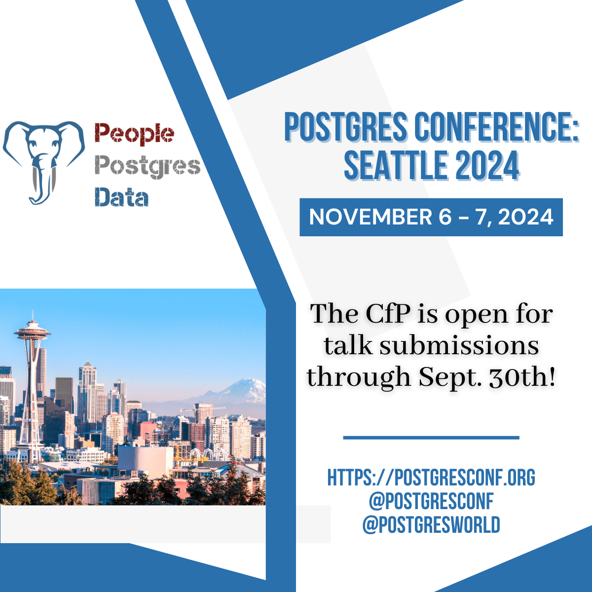 Take this opportunity to shine as a thought leader in the Postgres world. Share your journey, inspire innovation, and connect with a vibrant community that’s as passionate about Postgres as you are. Submit your proposal today and join us in Seattle for an unforgettable experience!