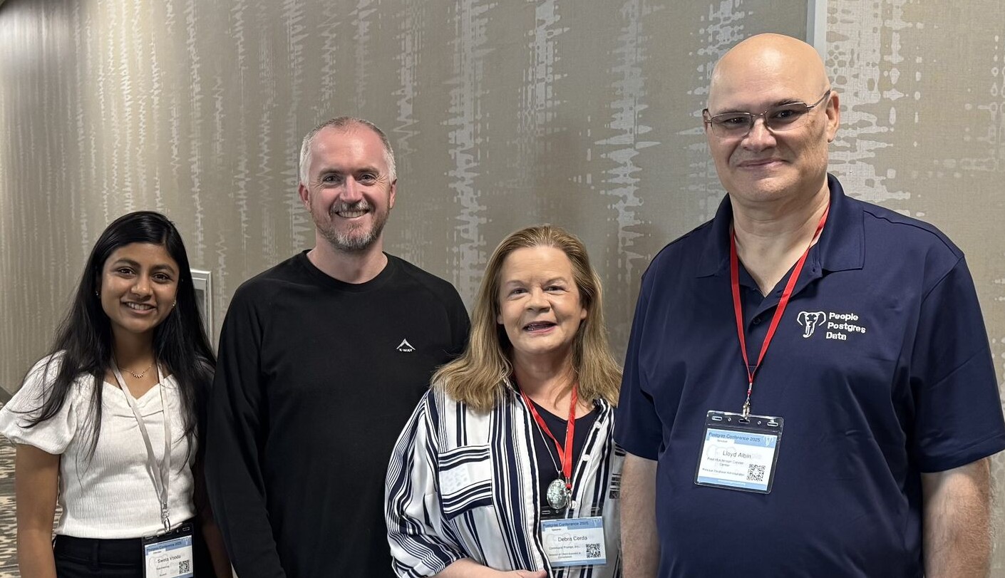 Just a few of our organizers from Postgres Conference 2025 in Orlando: Sweta Vooda, Onsite Session Coordinator; Malcolm McLean, AV & Registration Coordinator; Debbie Cerda, Talk Selection Committee & Speaker Liaison; Lloyd Albin, AV Logistics & Registration Coordinator (Photo Courtesy of Sweta Vooda)