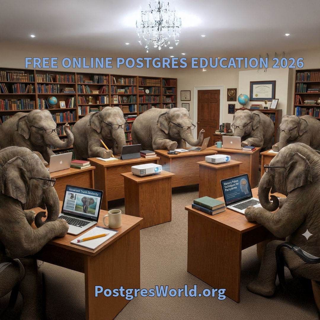 Once again the People, Postgres, Data community is bringing the best in all things Postgres Education. This year we have moved training to the PostgresWorld Training sessions . The Webinars are 100% Free Postgres Education.